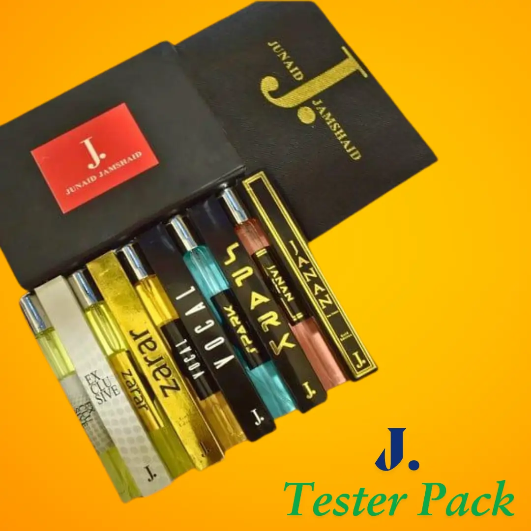 Pack of 5 Best Selling Perfume Tester by Junaid Jamshaid. This tester pack include tester perfume of “Janan, Spark, Exclusive, Essence and Zarar.
